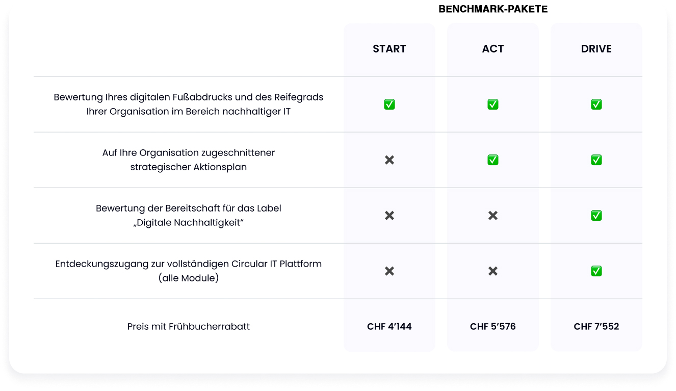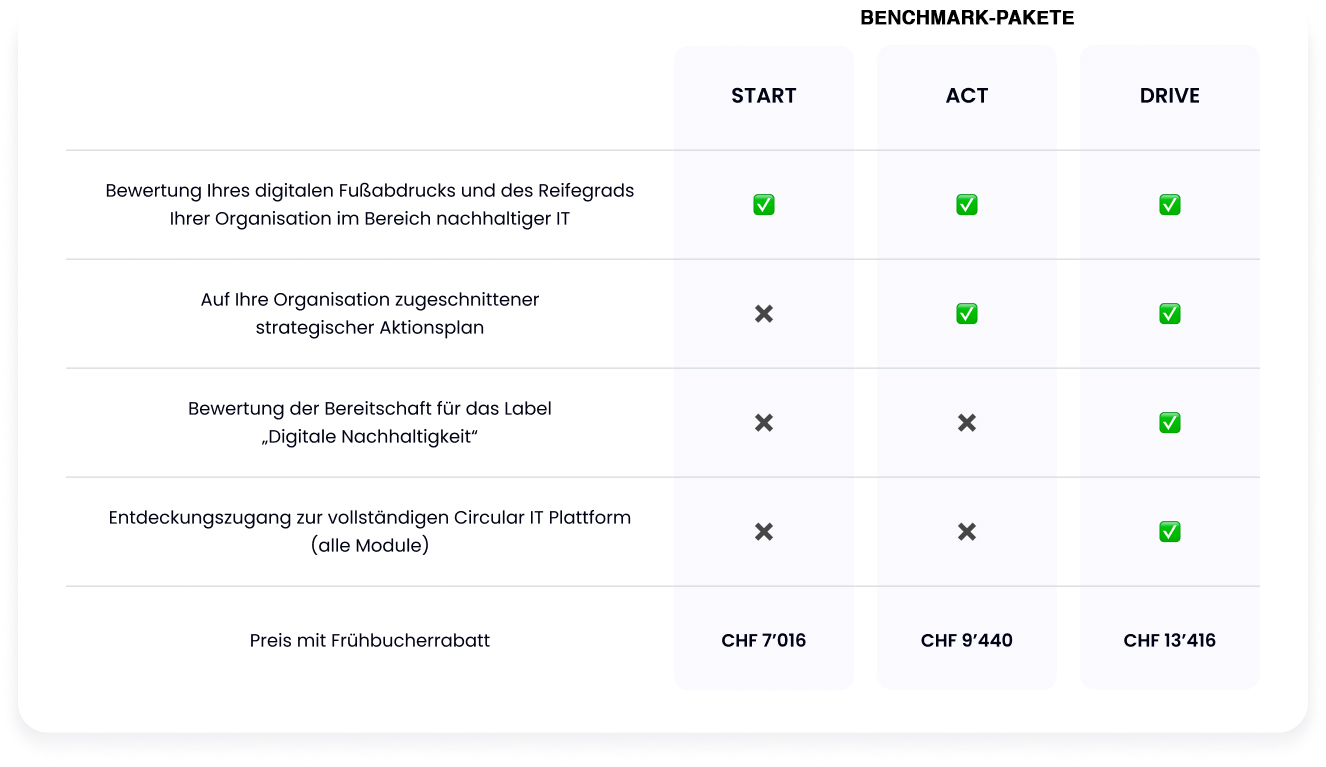Bewerten und vergleichen Sie einfach digitalen Fußabdruck, Kosten und Nachhaltigkeitsreife.